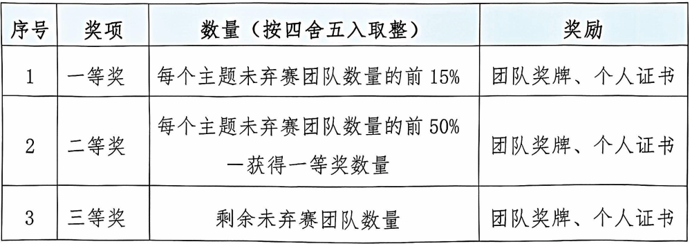 2.区域赛奖项设置:区域赛按照本主题实际未弃赛团队的10%、20%、30%设立一、二、三等奖。其他未弃赛的团队如需参赛证明,可在线申请。
