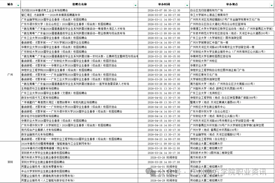 这份广州、深圳两地3-4月招聘会汇总,覆盖校园招聘、综合双选、专场对接等多种类型,从传统工科到数字经济,从师范医疗到跨境电商,总有一场适合你: