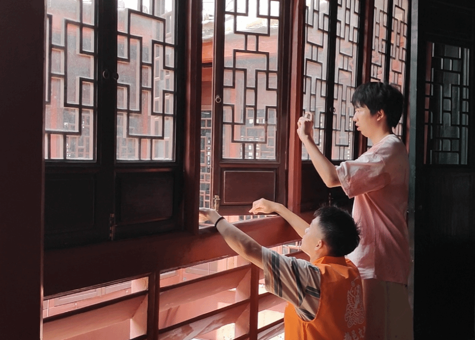 A组率先前往榕城区博物馆展开探索。踏上阁楼,阳光透过木质窗棂洒下斑驳光影,书桌上摆着一摞书,引人遐想。轻轻推开廊窗,窗框外的景色与窗内的旧物相映,彷佛跨越时间的洪流实现古今交融。我们抓住时机,用镜头定格下这一瞬间。