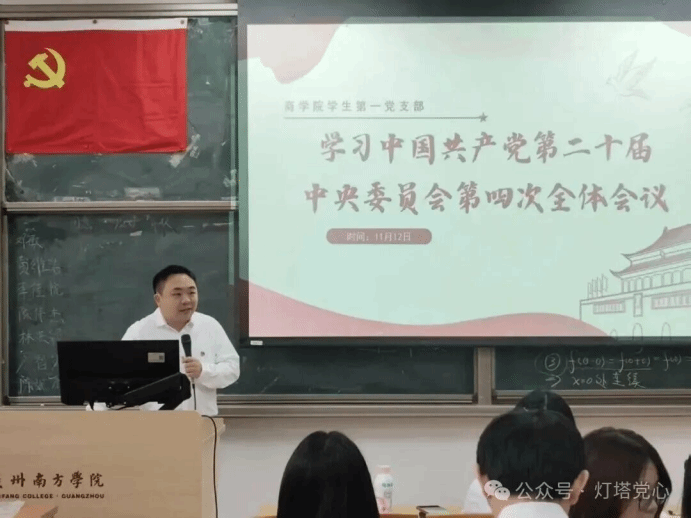 转正议程圆满结束后,陆正祥书记以“深入学习贯彻党的二十届四中全会精神”为主题,为全体党员讲授专题党课。他强调,新时代学生党员要把学习贯彻全会精神与自身成长发展紧密结合,既要筑牢思想根基,也要立足校园阵地,在学习科研中攻坚克难,在志愿服务中践行宗旨,以实际行动诠释共产党员的责任与担当。党课内容深入浅出、内涵丰富,让全体党员深受启发与教育,进一步凝聚了党支部共识、强化了使命担当。