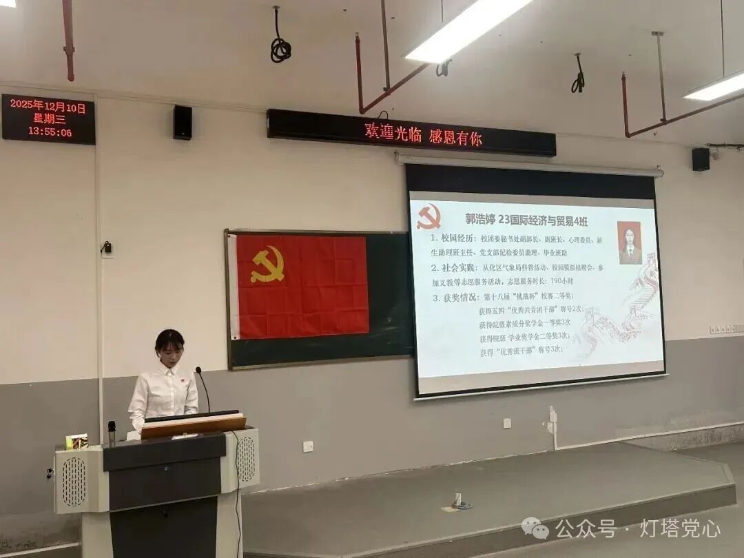 商学院学生第三党支部于2025年12月10日在F5教209室召开商学院学生第三党支部党员大会。参加本次会议的人员有商学院学生第三党支部书记胡敬成老师、商学院学生第三党支部副书记文俊杰老师,以及商学院学生第三党支部全体党员、预备党员。本次会议由党支部的许秀萍同志主持。