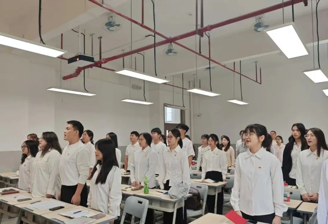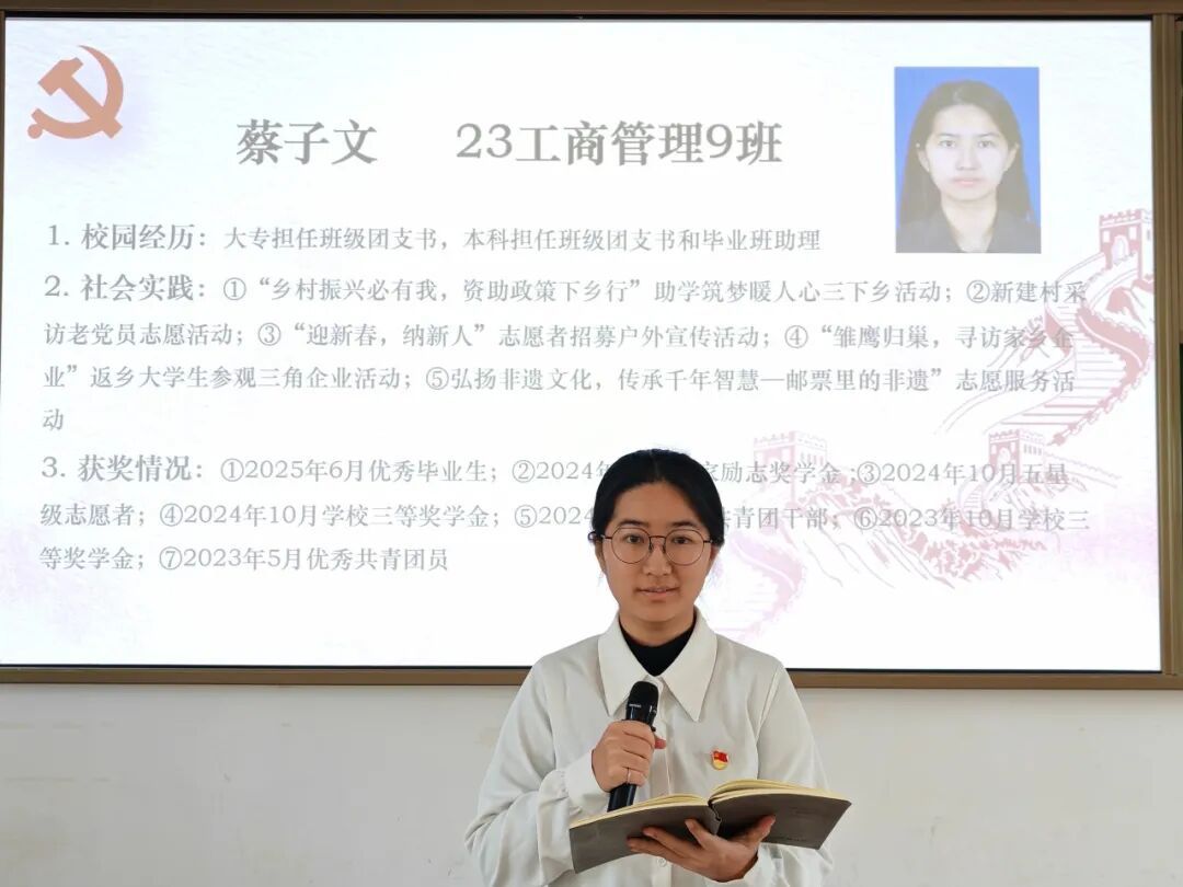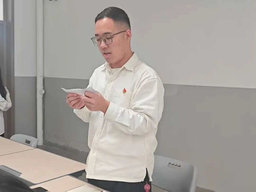最后,商学院学生第五党支部书记熊新新老师作总结发言,他首先向如期转正的党员和新当选的党支部委员表示祝贺,并强调,转正与当选既是光荣,更是沉甸甸的责任。他勉励全体同志要始终不忘初心、牢记使命,在学习、工作和生活中切实发挥先锋模范作用,自觉将个人成长融入党和国家的发展事业,让青春在为党和人民奉献中焕发绚丽光彩。