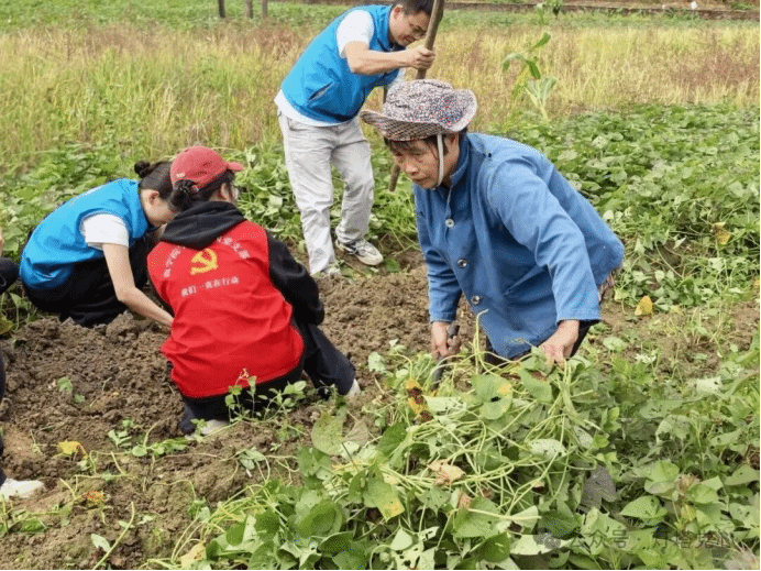 薄雾轻笼迎朝露,党旗飘扬映田畴。商学院学生第四党支部的成员们身着统一志愿服装,背起竹篮,踏着晨露,与当地农户并肩走向田间地头。在番薯采收现场,商学院学生第四党支部的成员和社工们俯下身子、沉下心来,在农户的指导下认真学习采挖技巧,从斩苗、松土、挖掘到拾拣、装筐,每一个环节都细致认真,力求不伤薯体、不漏果实。经过一上午的辛勤劳作,田埂上堆起了一座座“小红山”,新采挖的红薯色泽鲜亮、品质优良,承载着大自然的馈赠与农人的辛勤汗水。商学院学生第四党支部的成员们在劳动中体会“粒粒皆辛苦”的深刻内涵,在躬身实践中锤炼党性修养,厚植为民情怀。