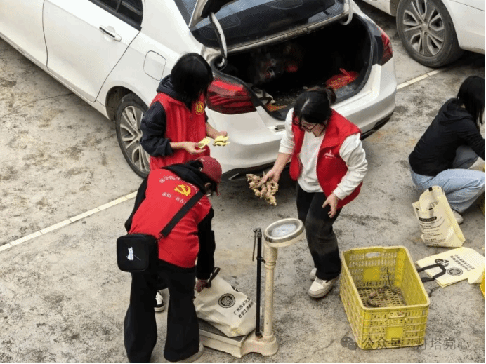 在番薯采收有序推进的同时,生姜的采后处理工作也同步展开。午饭过后,商学院学生第四党支部的成员和社工们分工协作,协助农户对刚采收的生姜进行分拣、去泥、称重、打包。清脆的报数声、计算器的滴答声与欢笑声交织在田间,现场秩序井然、氛围热烈。“这一筐,二十斤!”“这一袋,三十五斤!”每一组数据的确认,不仅是对农产品重量的核实,更是对农民辛勤劳作成果的尊重与肯定。一箱箱打包整齐的生姜即将通过助农渠道销往城市,打通从田间到市场的“最后一公里”,切实帮助农户拓宽销路、增加收入。