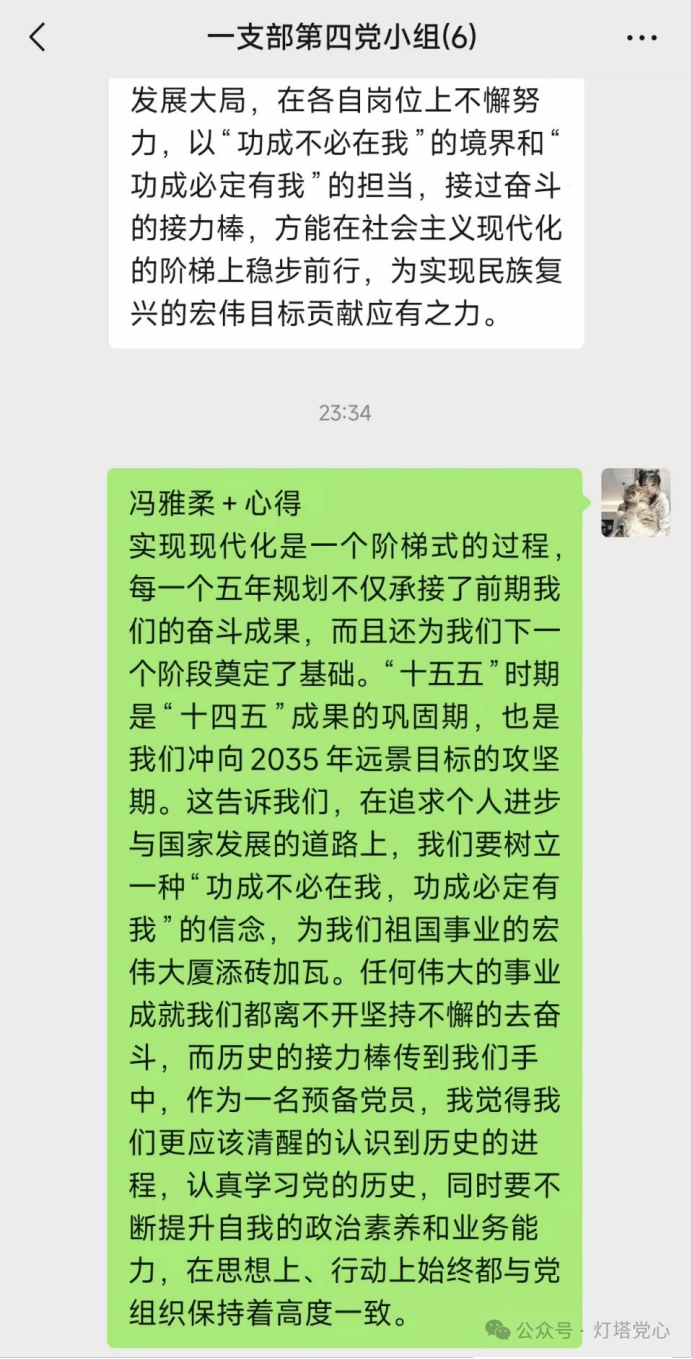 实现现代化是一个阶梯式的过程,每一个五年规划不仅承接了前期我们的奋斗成果,而且还为我们下一个阶段奠定了基础。“十五五”时期是“十四五”规划成果的巩固期,也是我们冲向2035年远景目标的攻坚期。这告诉我们,在追求个人进步与国家发展的道路上,我们要树立一种“功成不必在我,功成必定有我”的信念,为我们祖国事业的宏伟大厦添砖加瓦。任何伟大的事业成就我们都离不开坚持不懈地去奋斗,而历史的接力棒传到我们手中,作为一名预备党员,我觉得我们更应该清醒的认识到历史的进程,认真学习党的历史,同时要不断提升自我的政治素养和业务能力,在思想上、行动上始终都与党组织保持着高度一致。