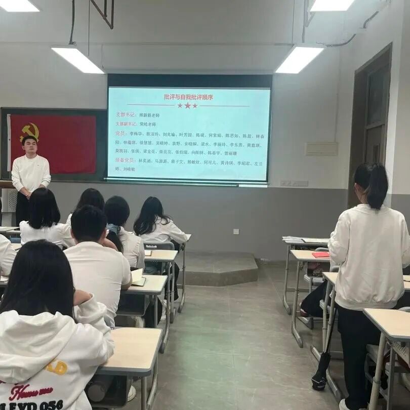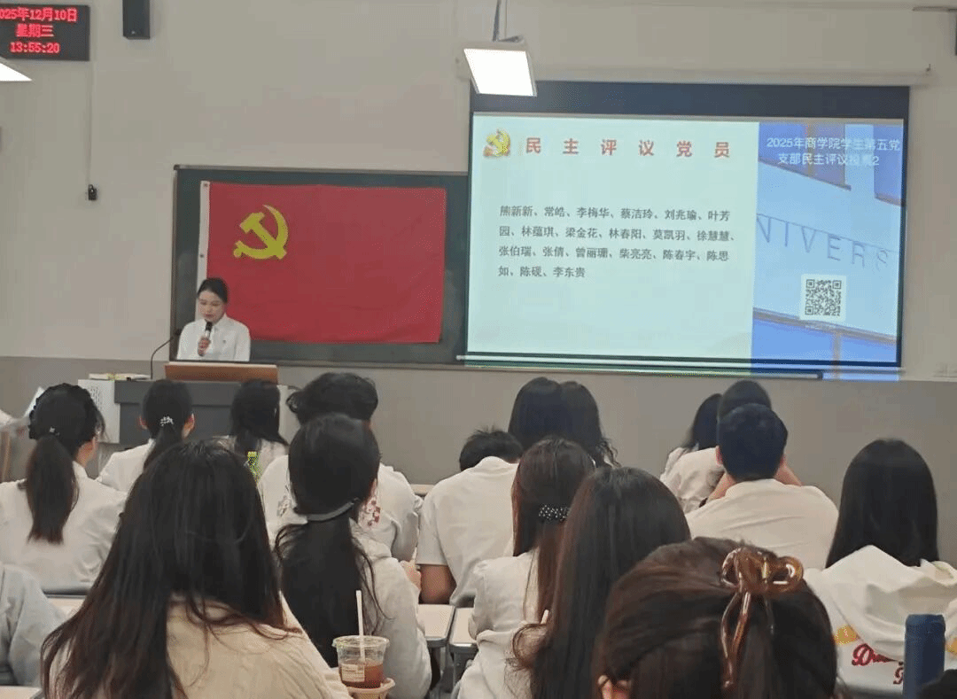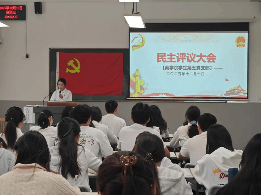 为持续深入学习贯彻习近平新时代中国特色社会主义思想和党的二十大精神,进一步加强对党员的教育、管理和监督,提升党员队伍的先进性与纯洁性,商学院学生第五党支部于2025年12月10日在神岗校区F5教201教室召开民主评议大会。本次会议由此次会议由蔡洁玲同志主持,党支部党员共同参与。