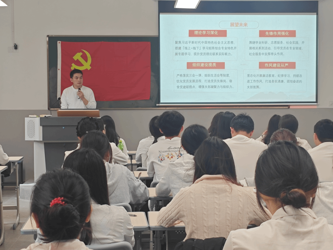 会议第三项议程,商学院学生第五党支部书记熊新新老师代表支委会作2025年度党支部工作总结报告。报告从组织建设、制度落实、学习教育、活动开展、党员作用发挥等方面全面回顾了党支部一年来的工作成效,系统介绍了在推进“三会一课”规范化、开展党的创新理论学习、推动党建与职业能力培养融合等方面的具体举措,并实事求是地剖析了当前存在的问题与改进方向。