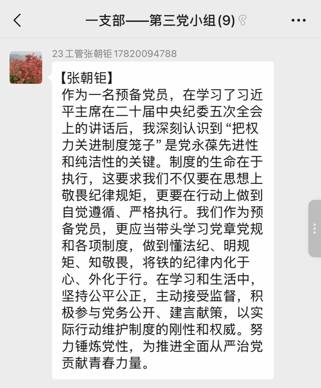 作为一名预备党员,在学习了习近平主席在二十届中央纪委五次全会上的讲话后,我深刻认识到“把权力关进制度笼子”是党永葆先进性和纯洁性的关键。制度的生命在于执行,这要求我们不仅要在思想上敬畏纪律规矩,更要在行动上做到自觉遵循、严格执行。我们作为预备党员,更应当带头学习党章党规和各项制度,做到懂法纪、明规矩、知敬畏,将铁的纪律内化于心、外化于行。在学习和生活中坚持公平公正,主动接受监督,积极参与党务公开、建言献策等,以实际行动维护制度的刚性和权威。努力锤炼党性,为推进全面从严治党贡献青春力量。