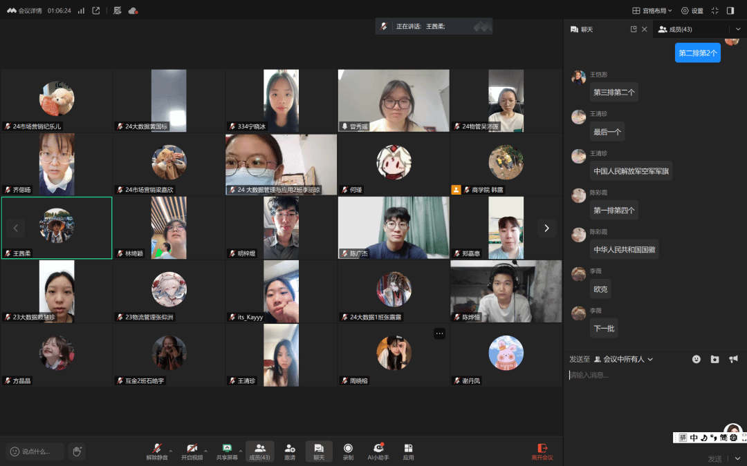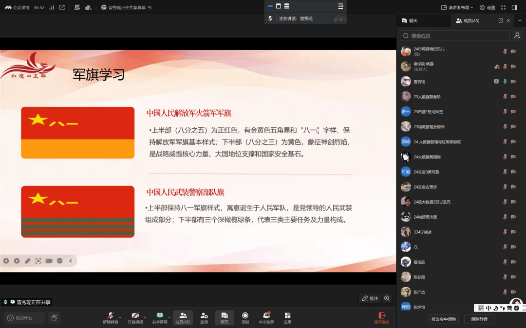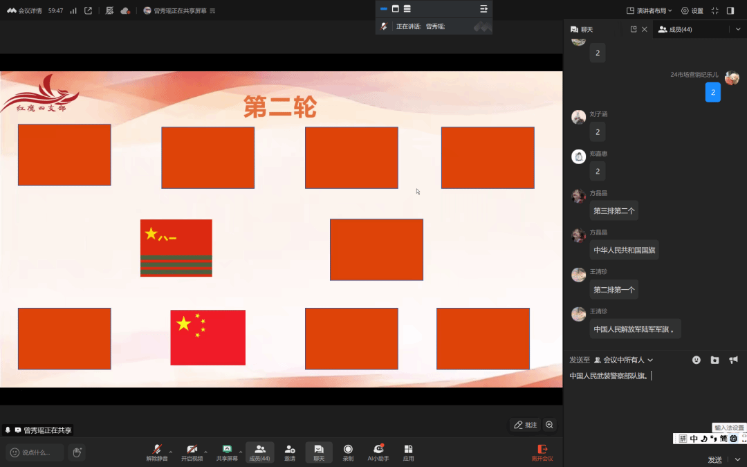 学习会尾声,曾秀瑶同志策划开展趣味小游戏“女巫的毒药”,加深同学们对军旗知识的了解。三轮竞赛中,学生们积极参与,通过翻牌答题,熟知中华人民共和国国旗、中国共产党党旗,以及解放军各军种军旗等意义。军旗是国家主权、军队荣誉的象征。识军旗、懂内涵,以促使学生党员厚植家国情怀,牢记守护使命。