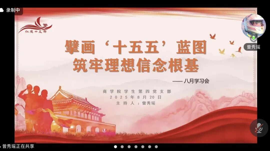 为深入学习“十五五”规划相关内容,强化学生党员理想信念,8月20日,商学院学生第四党支部于线上开展了以“擘画‘十五五’蓝图,筑牢理想信念根基”为主题的学习会。参与本次主题学习会的有商学院学生第四党支部书记韩露老师、副书记谢丹凤老师、全体党员、预备党员、发展对象以及入党积极分子等。本次会议由曾秀瑶同志主持。