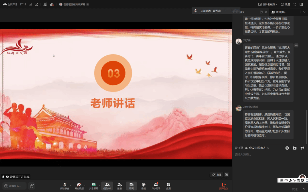 理想信念是青年成长的“灯塔”,更是大学生党员党性修养的“总开关”。深学理论可掌握科学世界观,实干实践能锤炼信念,向先烈楷模学习可锚定国家发展大局。曾秀瑶同志组织商学院学生第四党支部成员观看专题视频并引领商学院学生第四党支部成员感悟信念力量。观看视频后,同学们互动交流热烈并分享多元感悟:或强调以理论为“压舱石”,或结合志愿服务谈实干决心,或提出向榜样汲取力量、让青春对接国家需要。理论实践深度融合,助力筑牢理想根基。