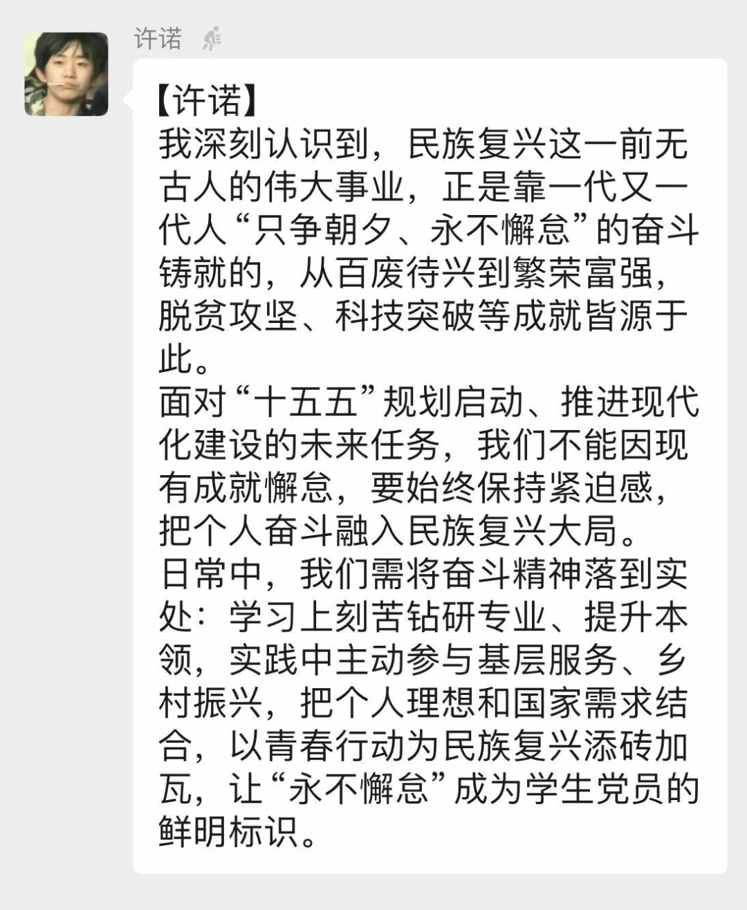 日常中,我们需将奋斗精神落到实处:学习上刻苦钻研专业、提升本领,实践中主动参与基层服务、乡村振兴,把个人理想和国家需求结合,以青春行动为民族复兴添砖加瓦,让“永不懈怠”成为学生党员的鲜明标识。