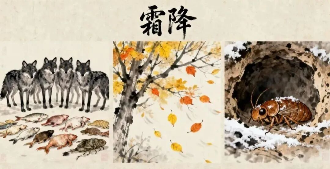 古人对霜降有着细致的观察与深刻的感悟。他们从霜降的物候变化中,感受到了自然的韵律,形成了对“三候”的精准总结。一候“豺乃祭兽”,此时豺狼开始大量捕猎,会将猎物整齐摆放,似“祭祀”般储存过冬粮食,这是动物对季节变化的本能应对;二候“草木黄落”,经霜打后的草木失去最后一丝生机,叶片枯黄、簌簌飘落,裸露出遒劲的枝干,为大地积攒来年的养分;三候“蜇虫咸俯”,蟋蟀、青蛙等小生灵早已躲进洞穴,蜷缩身体、停止活动,以“休眠”的方式对抗严寒,等待春日的唤醒。大自然以独特的方式,展现着生命的轮回与更替。这一节气的到来,不仅是对自然规律的呈现,更蕴含着古人对生命的思考,让我们感受到时光的流转与生命的坚韧。