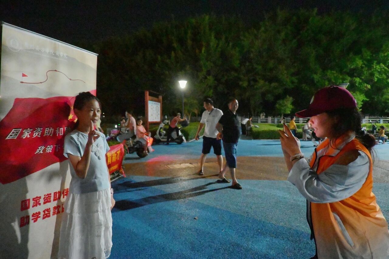 晚上,团队来到杨和市民广场,在广场一角搭建了醒目的学生资助政策咨询点,开展摆摊宣传活动。现场热闹非凡,不少家长带着孩子闻讯而来,纷纷围拢到摊位前进行询问和了解。我们热情地为他们答疑解惑,发放宣传资料,结合实际案例深入讲解资助政策,让家长们切实感受到国家资助政策的温暖与力量,也为孩子们的教育发展带去了一份希望与保障。