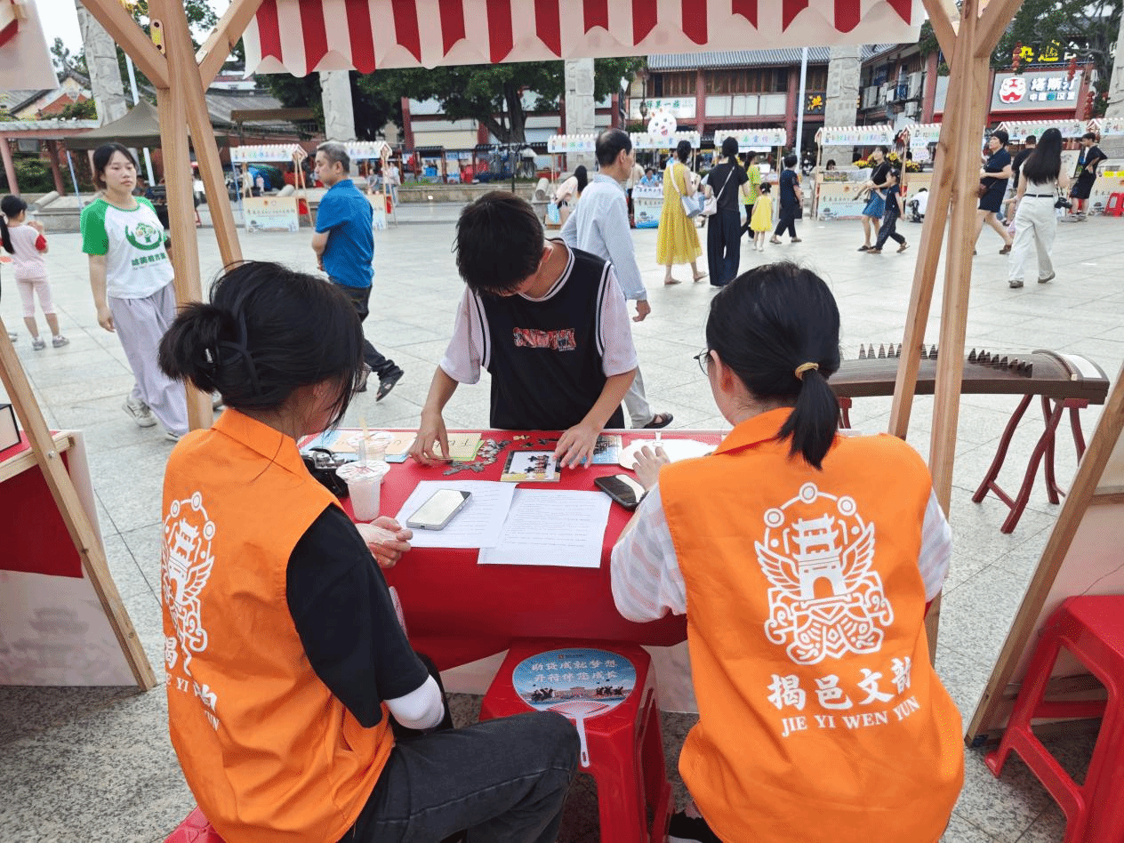 夜幕降临,学宫广场的文创义卖活动拉开帷幕。摊位前人头攒动,古城明信片上,榕城的标志性建筑在笔墨间焕发生机;古建筑图案冰箱贴则将文化韵味融入日常。“潮汕话绕口令”“拼建筑拼图” 等互动游戏更是点燃了市民的参与热情,大人小孩一同绞尽脑汁,在欢声笑语中加深了对本土文化的认知。此次义卖不仅为先锋队后续的实践活动筹集了资金,更以轻松有趣的方式让更多人感受到古城文化的魅力。