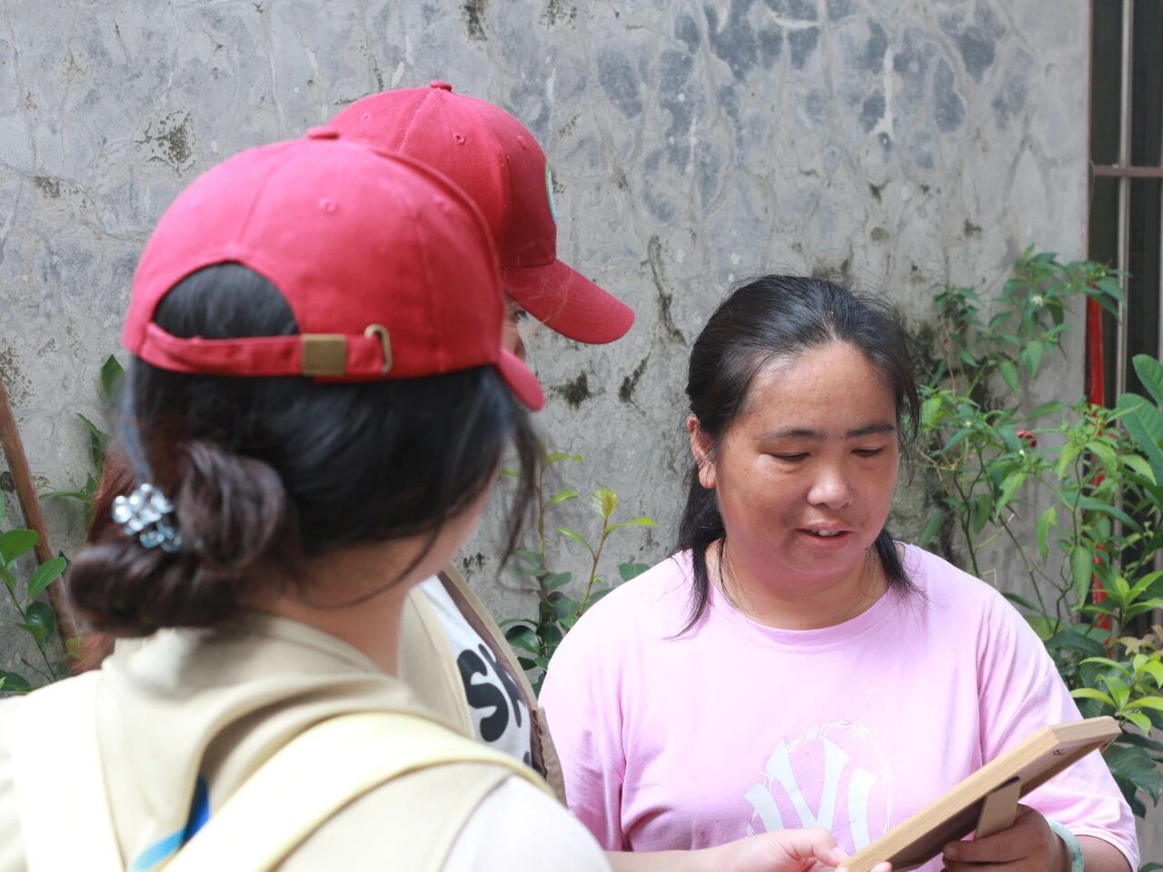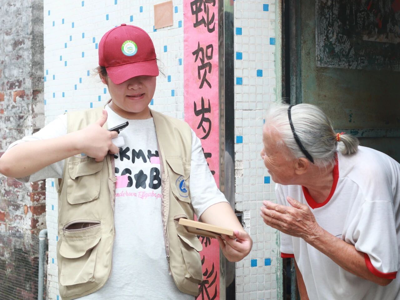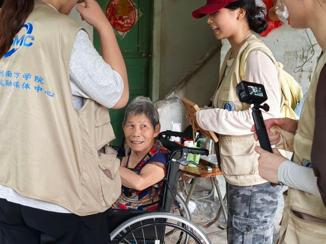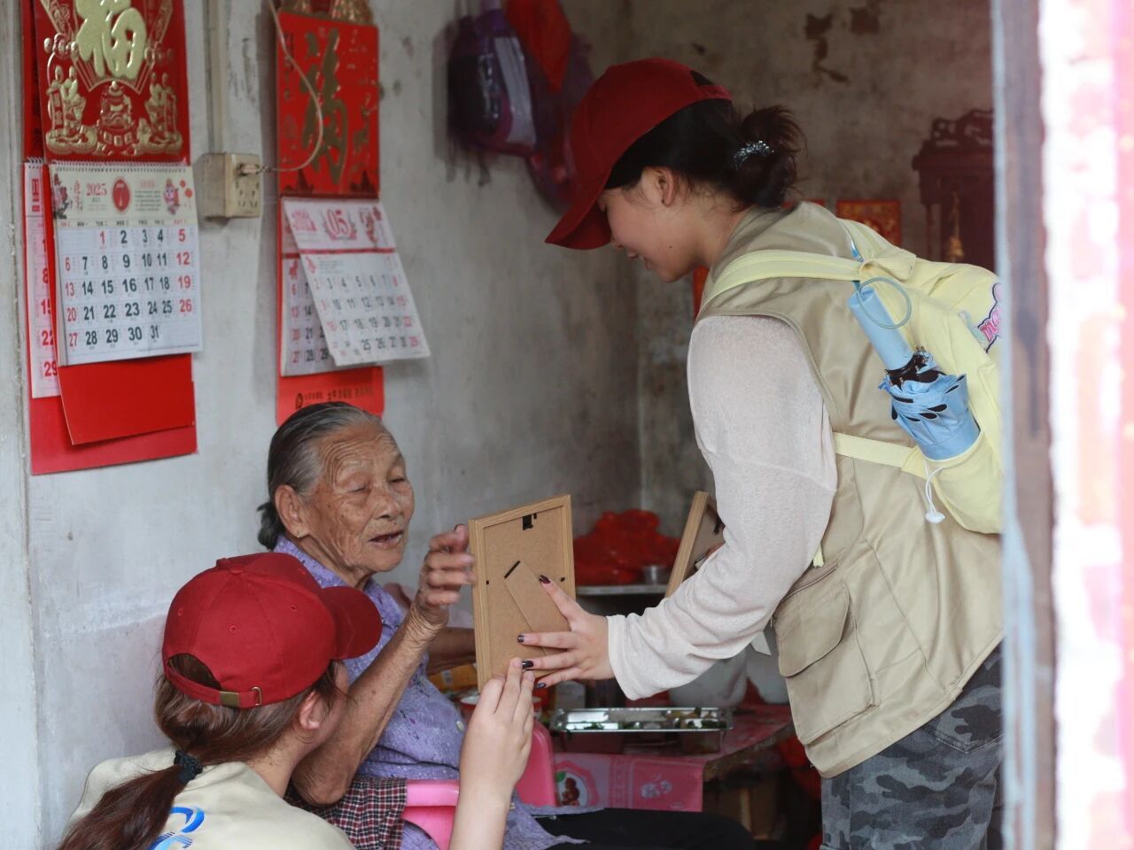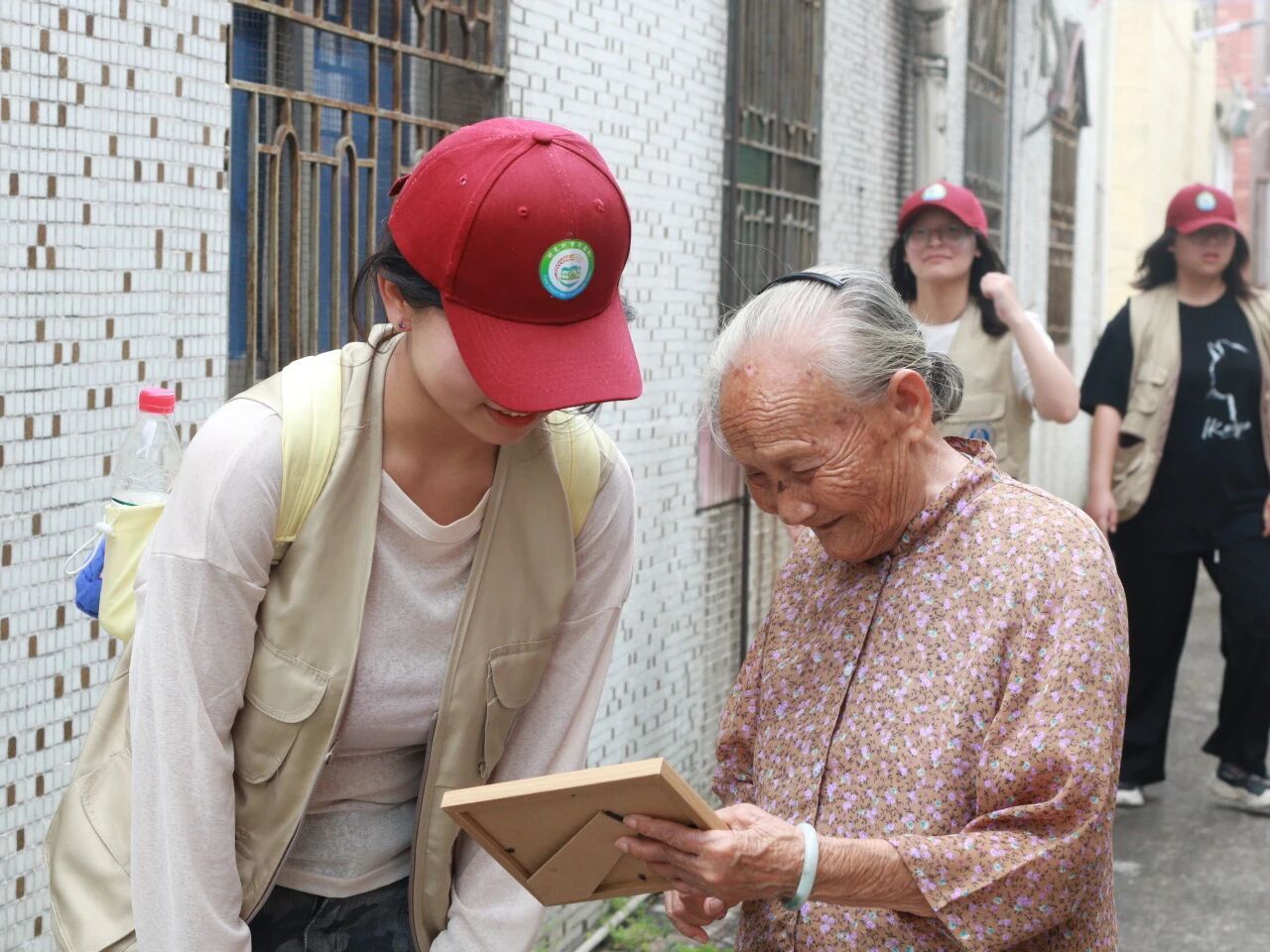 我们特意带上了精心准备的相框,里面装着上次走访时为每个人家拍下的合影。当把相框递到奶奶手中时,看着奶奶接过相框,先是眯眼凑近了看,随即眼角的皱纹舒展开,嘴角咧开时,露出几颗不太整齐的牙,却透着一股子实在的欢喜,连带着声音都带着笑意的颤音,用指腹轻轻点着照片里的人,嘴里念叨着“哦,吼靓哦!”也用粤语亲切问候着“喝茶来喝茶。”很是温暖与有意义。有人笑着说“这照片拍得真好,这得挂起来”,有人用指腹摩挲着相框边缘,道着一声又一声的谢。这些瞬间,让我们更明白我们的这段时间的付出是有意义的,这不是什么惊天动地的回响,而是在这样的日常里,被人实实在在地记取、珍藏,然后化作一句“常来喝茶”的惦念。我们递出的是相框,接住的却是比阳光更暖的人间烟火。