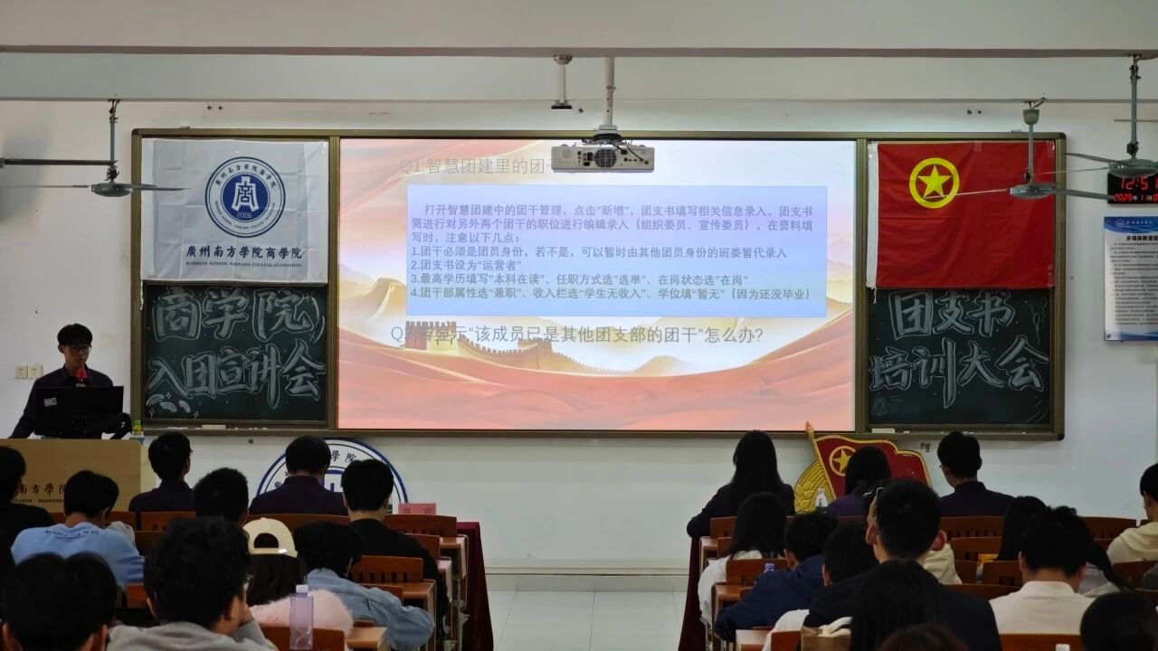 为进一步规范基层团组织建设,明确团支书工作职责,引导青年学生积极向团组织靠拢,11月5日,广州南方学院商学院入团宣讲会暨团支书培训大会在昂扬的氛围中顺利举行。参与本次大会的嘉宾有商学院团委主要负责人徐文熙老师、商学院主席团以及全体团支书,为学院共青团工作注入青春动能。