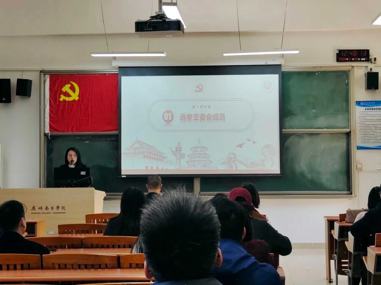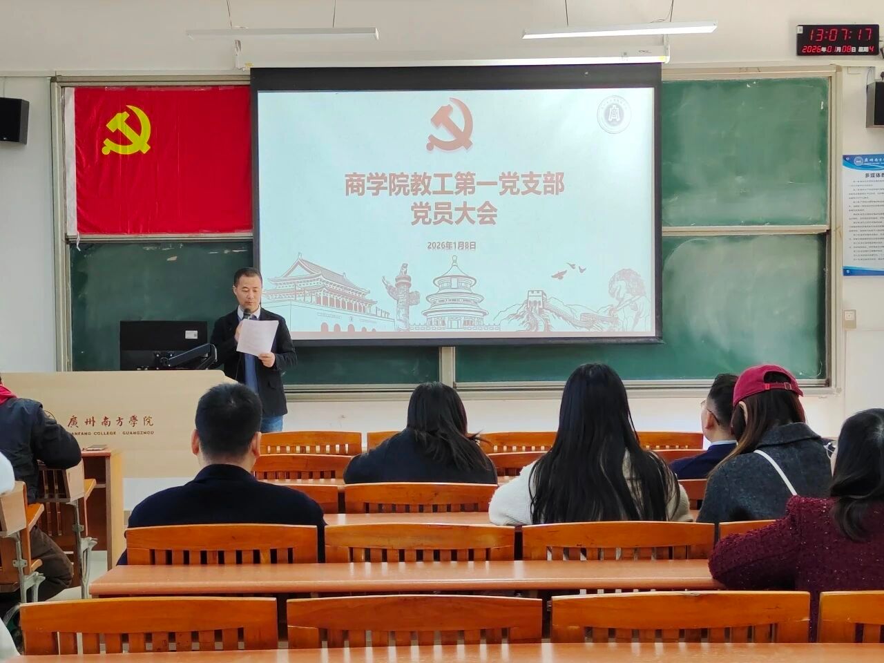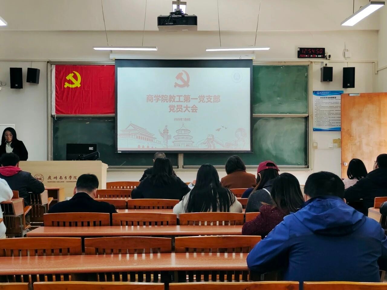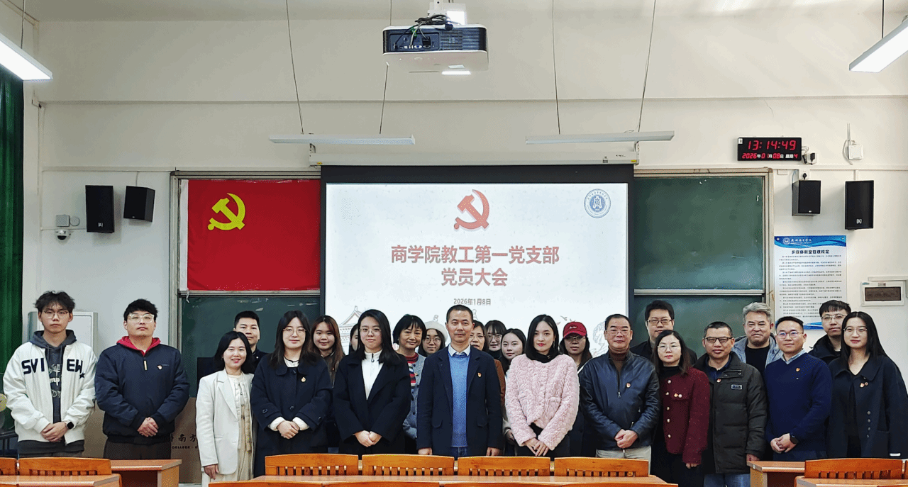 2026年1月8日,商学院教工第一党支部在8教202教室隆重召开支部党员大会,并组织开展专题党课学习。本次会议由党支部副书记唐子惠同志主持,教工第一党支部全体党员参加。