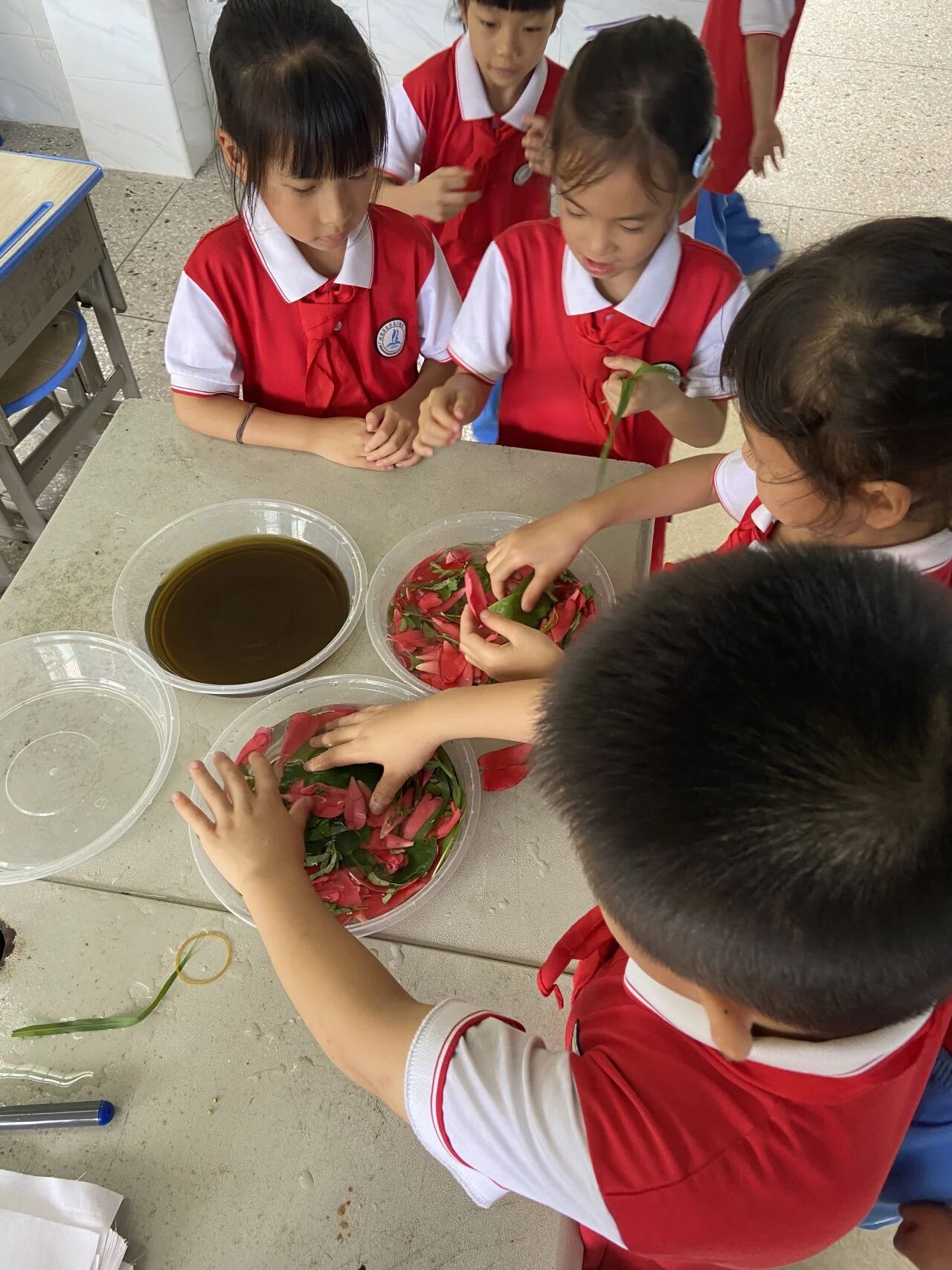 回到教室,拓染的“创作战场”立刻热闹起来。首先我们一起把植物泡在明矾水里固色,虽然是课间休息时间,但同学们都围上来一起帮忙。