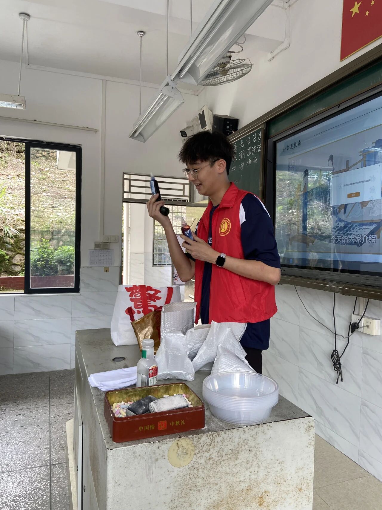 随后,小老师依次展示并介绍了扎染所需的全部工具,系统演示了从“如何折叠布料以保证对称效果”到“绳线松紧度与留白面积的关系”等基础技法。部分同学将棉布折成三角形后,以礼品包扎方式缠绕线绳;部分同学效仿示范,将布料卷成柱状并紧密扎结;另有几名男同学将布料随意揉捏成团,试图通过不规则捆扎方法探索全新纹样。