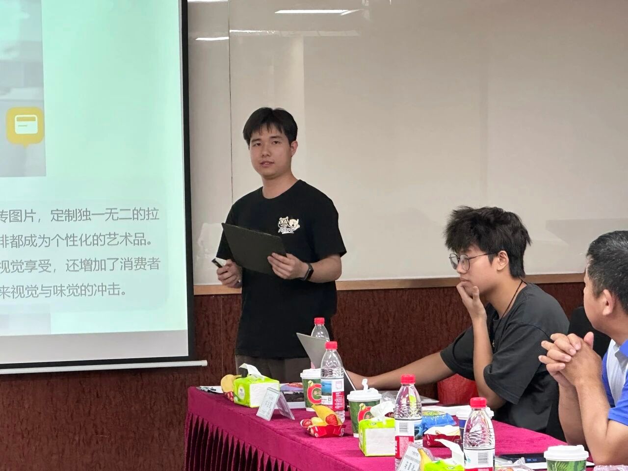 “头号玩咖”AI拉花咖啡机项目学生代表则介绍了该团队独创的“咖啡AI拉花技术”。团队同学该项目从市场分析、目标人群定位到商业模式设计,全方位展示了项目的创新性与技术可行性。该项目通过依托AI拉花技术打造智能咖啡产品,以技术革新瞄准年轻消费市场,发展潜力无限,赢得与会校企双方老师和领导们的一致好评。
