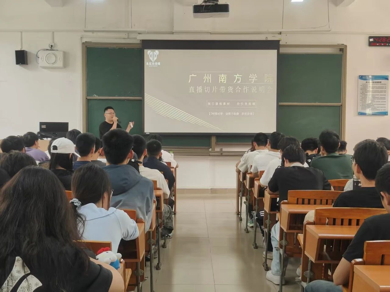宣讲会于14:30正式开始,现场座无虚席。企业代表围绕直播切片的行业背景、工作内容、实践模式及成长路径进行了系统介绍,并结合真实案例,详细讲解了从素材剪辑、内容优化到流量分发的完整流程,使学生直观感受到新媒体电商的运作逻辑与发展潜力。