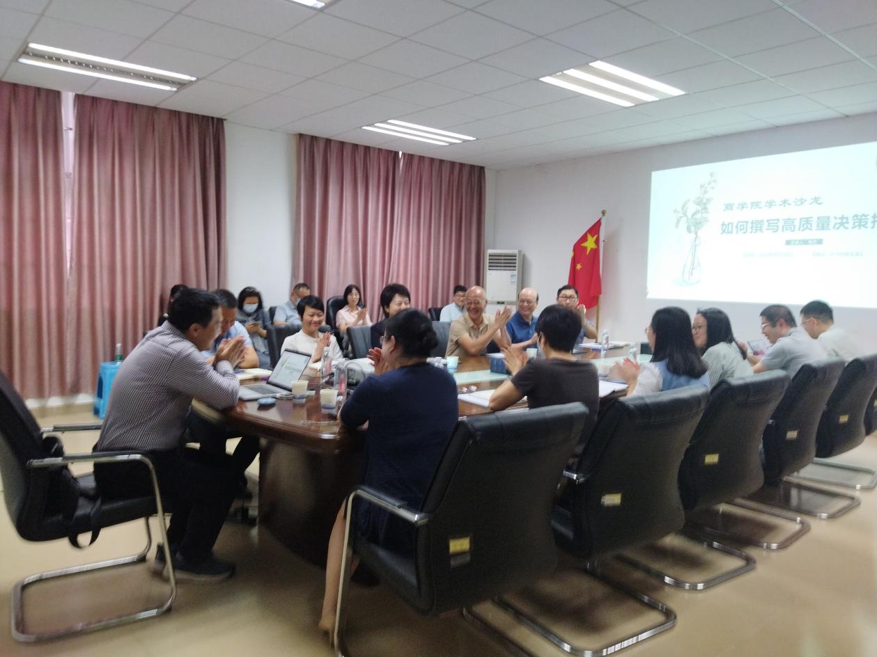 5月10日下午,商学院在108会议室举办学术沙龙,客座教授兼副院长李杰教授围绕如何撰写高质量决策报告与教师进行交流座谈。沙龙由商学院院长何兴强主持。