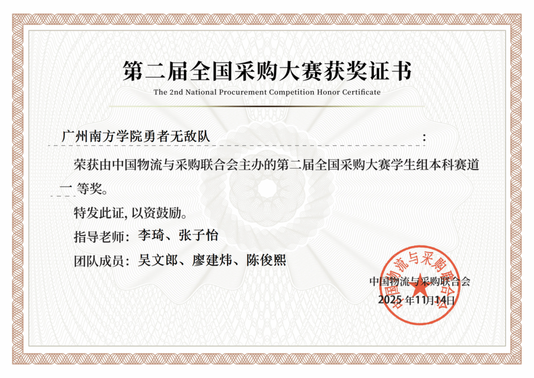经过为期3个多月的激烈角逐,由中国物流与采购联合会主办的第二届全国采购大赛圆满收官,来自全国物流供应链行业相关单位的职工组和高校物流相关专业的学生组,120支晋级团队在总决赛竞争最终名次。广州南方学院商学院组建的勇者无敌队——来自物流管理专业的吴文郎、陈俊熙、廖建炜同学和指导老师李琦、张子怡团队在阶段考核和总决赛中以黑马之势从理论考核到实战模拟,团体演练、复盘配合默契,最终实战过关评分位列总决赛小组第一名,勇夺学生组-本科赛道一等奖。