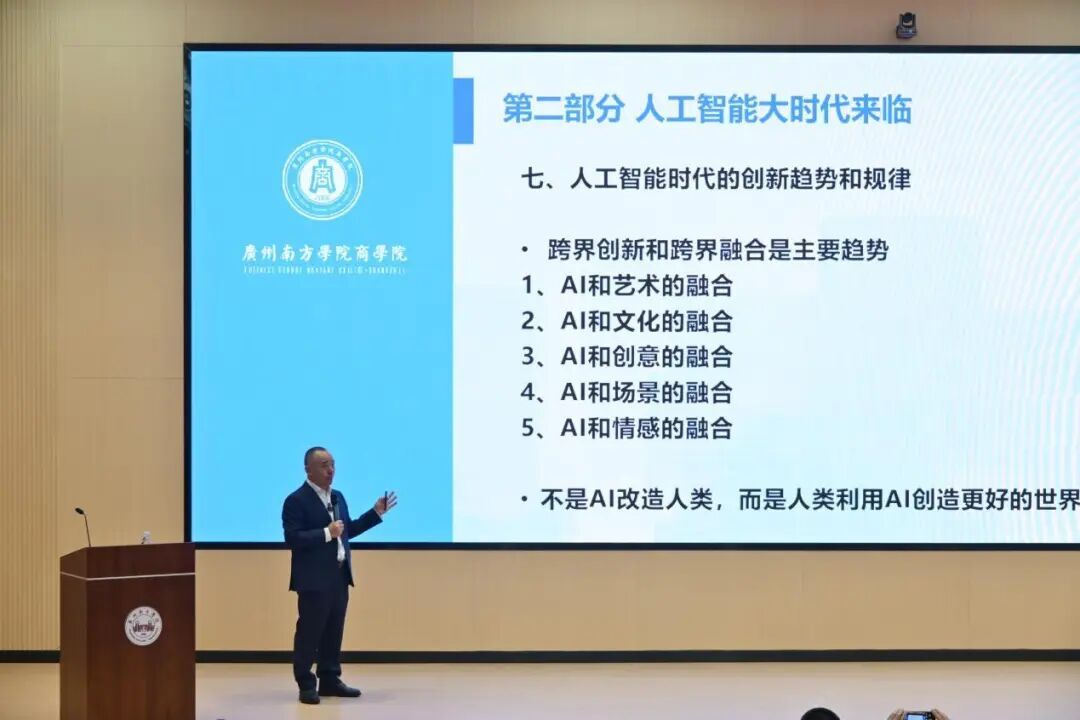 围绕人工智能的本质与构成,向教授系统阐释了四大核心要素:算力、算法、数据、创新。算力依托超级计算、芯片、材料、能源;算法决定效率与应用边界;数据成为全新生产要素;创新依赖跨界融合与想象力。他强调,人工智能具有规模收益指数级增长的特征,其迭代、普及、降本速度远超以往工业革命,并特别指出“所有行业发展的终极基础都是材料”。面向商科学生,他分析指出,AI驱动的健康消费、文化消费、情感消费、新型娱乐消费等领域蕴含广阔机遇。