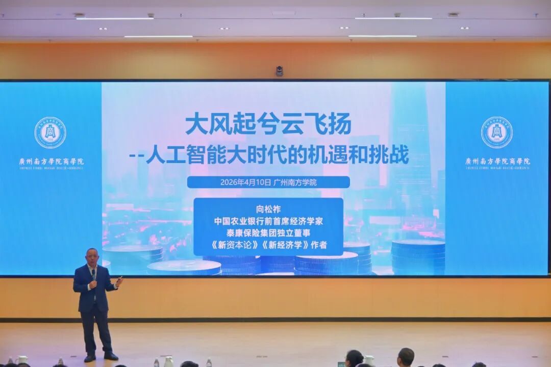 讲座正式开始前,举行了隆重的客座教授聘任仪式。商学院院长叶龙森教授首先致欢迎辞,高度评价向松祚教授在宏观经济学领域的杰出贡献及其在学术界与业界的广泛影响力。叶教授指出,人工智能正深刻重塑全球商业格局,为培养能够引领未来变革的高素质商科人才,学校正式聘任向松祚教授为广州南方学院客座教授,期望依托其深厚的学术视野与实践经验,助力学院人才培养与学科发展。随后,校党委书记李建超代表学校向向松祚教授颁发客座教授聘书,全场报以热烈掌声。